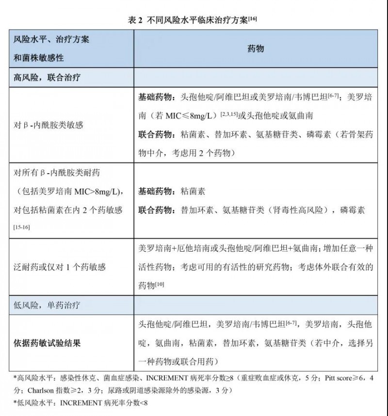 此外,CRE耐藥菌株往往表現(xiàn)為廣泛耐藥特征,因此根據(jù)風(fēng)險水平調(diào)整用藥或開展聯(lián)合藥物方案,可有效降低CRE感染的死亡率。依據(jù)不同風(fēng)險水平推薦臨床治療方案見表2。