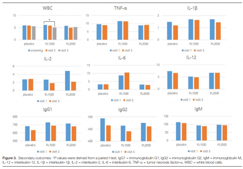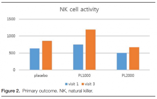實驗共有30名參與者被隨機分配到3組(PL1000組/PL2000組/安慰劑組),所有參與者每天兩次服用2粒桑黃提取物膠囊,持續(xù)8周。測量他們食用臨床試驗食品前后血液中的自然殺傷細胞(NK)活性和細胞因子水平。同時調(diào)查變量以評估安全性,例如不良反應、生命體征和異常發(fā)現(xiàn)。