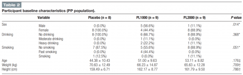 研究結(jié)果表明:通過NK細胞活性、白細胞介素IL-6、免疫球蛋白IgG1、IgG2 和IgM水平證實,與安慰劑組相比,桑黃PL1000 和 桑黃PL2000 組的免疫力有所提高。這種趨勢在PP人群(完成方案設計全過程用藥人群)中得到證實,這證明了桑黃(PL)提取物可有效提高免疫力。且在臨床實驗室測試、生命體征和身體檢查中未發(fā)現(xiàn)與桑黃相關的副作用。