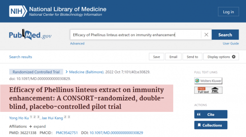 2022年10月,美國國立衛(wèi)生研究院National Institutes of Health (NIH)官網(wǎng)發(fā)布了一篇“桑黃提取物增強免疫的功效:一項 CONSORT隨機、雙盲、安慰劑對照試驗”研究論文,進一步表明桑黃具有有效增強人體免疫能力的功效。這是截止目前全球研究桑黃提升人體免疫力臨床的最新權威報告。