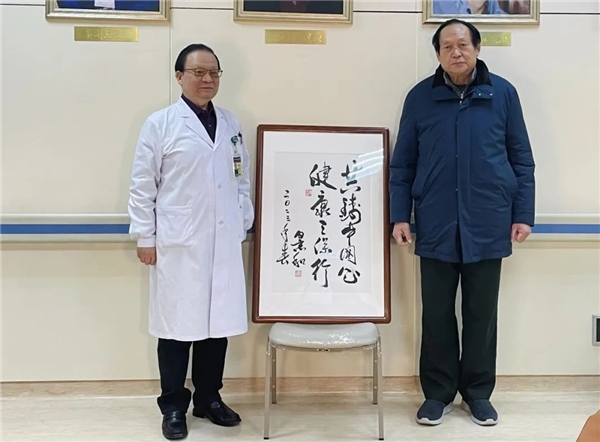 中國(guó)工程院院士郎景和(左)為“健康三?!鳖}詞。