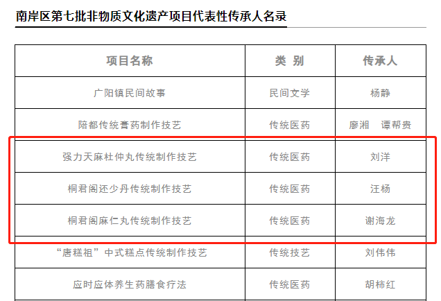 在以誠信和匠心制藥的同時,太極桐君閣藥廠意識到中醫(yī)藥傳承事業(yè)后繼乏人的現(xiàn)狀,為此,太極桐君閣藥廠積極培養(yǎng)中藥技藝傳承人,高度重視傳承人的隊伍建設(shè)。近期,南岸區(qū)文化和旅游發(fā)展委員會公布(南岸文旅發(fā)〔2023〕3號)南岸區(qū)第七批區(qū)級非物質(zhì)文化遺產(chǎn)代表性傳承人名錄,太極桐君閣藥廠劉洋、汪楊、謝海龍被評為桐君閣傳統(tǒng)中成藥制作工藝文化區(qū)級傳承人。
