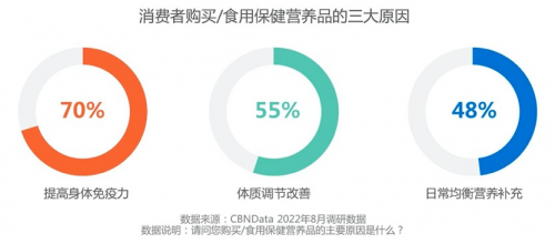 根據CBNData調研數據,在消費者購買、食用保健營養(yǎng)品的主要原因中,超七成受訪者表示是為了“提高身體免疫力”,近五成表示是為了“日常均衡營養(yǎng)補充”。