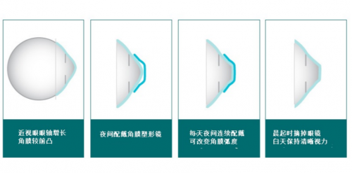 首先,讓我們了解一下OK鏡的工作原理。它的原理是把角膜中央?yún)^(qū)的區(qū)域變扁平,相當(dāng)于矯正了近視,同時(shí)它會(huì)在角膜的旁中心的區(qū)域形成一個(gè)離焦環(huán),這個(gè)離焦保護(hù)環(huán)讓近視度數(shù)長得緩慢一些。用戶在晚上睡覺時(shí)佩戴OK鏡,白天不需要鏡片,就可以擁有清晰的視力。