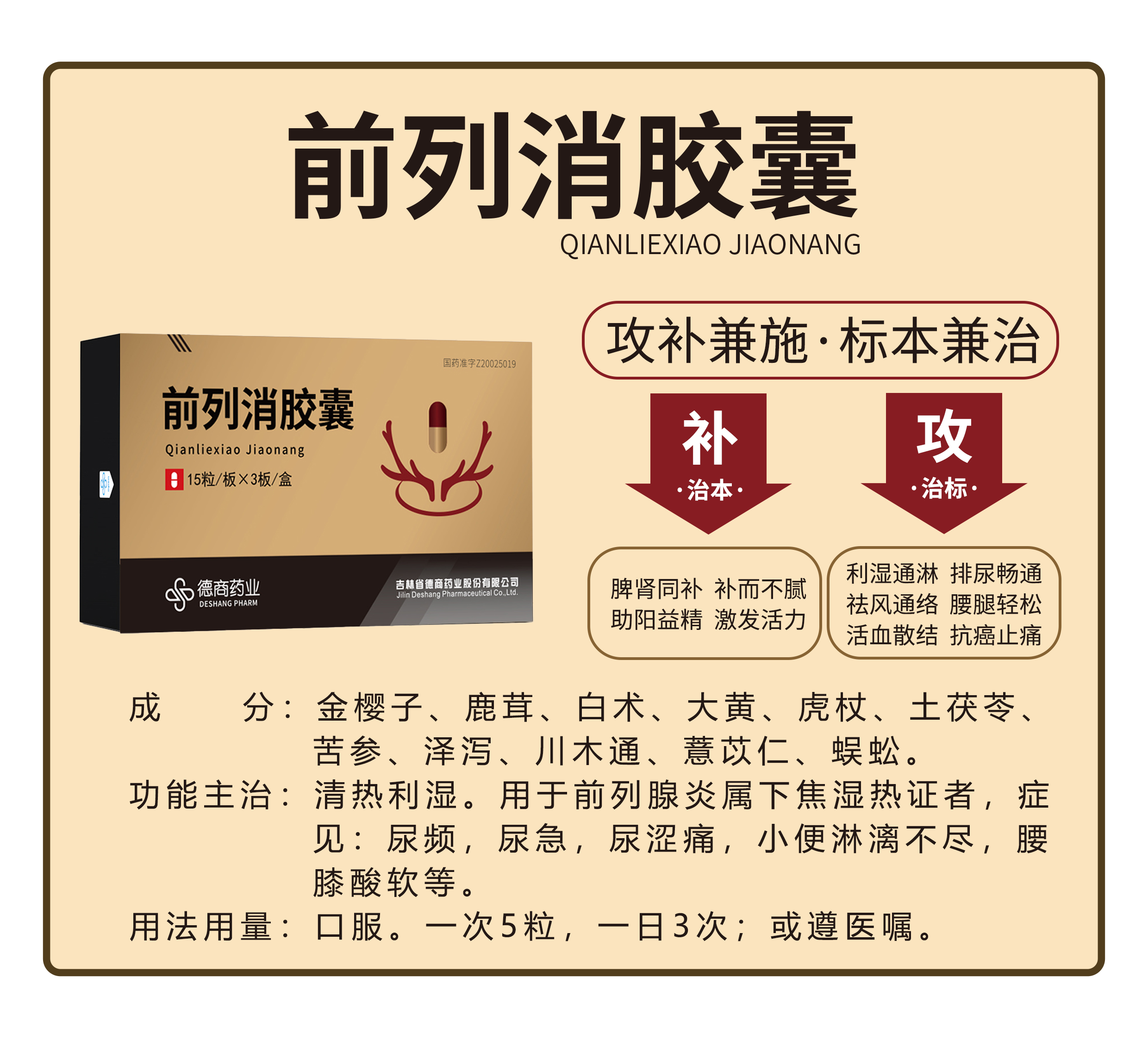 前列腺疾病,作為一種長期威脅男性生殖健康的疾病,需要我們充分的重視。德商藥業(yè)的前列消膠囊,由四大中醫(yī)古方加減化裁而來,包含有鹿茸、金櫻子、虎杖、蜈蚣等多味中藥。在強(qiáng)腎健脾的同時,也具有利濕通淋的功效,真正做到補(bǔ)而不膩,攻補(bǔ)兼施,標(biāo)本兼治。方中使用的鹿茸精選自被譽為“東北三寶”之一的長白山頂級梅花鹿鹿茸,其具有補(bǔ)精助陽,強(qiáng)筋健骨的功效,是治療男性生殖疾病的絕佳選擇。