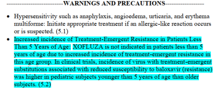 耐藥性問題 瑪巴洛沙韋在2017-2018年廣泛使用后,日本報(bào)告出現(xiàn)未服用過瑪巴洛沙韋的嬰兒及其家人體內(nèi)檢測出對瑪巴洛沙韋耐藥的甲型流感病毒突變株。意味著瑪巴洛沙韋耐藥病毒株已出現(xiàn)人傳人的傳播能力。美國FDA也對該藥發(fā)布了警告,指出5歲以下兒童不應(yīng)使用瑪巴洛沙韋,耐藥性高達(dá)40%,5-12歲的耐藥率也高達(dá)16%。美國兒科學(xué)會(huì)建議,僅在依從性差或無法耐受其他治療時(shí),才考慮使用瑪巴洛沙韋作為奧司他韋的替代。