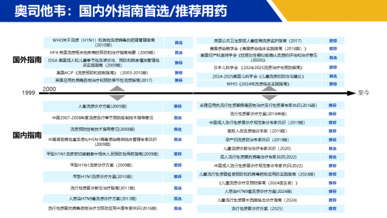奧司他韋是全球唯一被批準(zhǔn)用于流感治療和預(yù)防的口服藥物。自問世以來,憑借其顯著的療效和安全性,廣泛應(yīng)用于全球多個(gè)國家,并獲得權(quán)威指南的推薦,如WHO《2024年流感臨床實(shí)踐指南》和美國兒科學(xué)會(huì)《兒童流感預(yù)防與控制建議(2024-2025)》等。