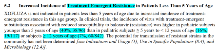 該藥中國版說明書亦表明,在兒童患者中,甲型/H1N1和甲型/H3N2病毒感染后,發(fā)生與瑪巴洛沙韋敏感性下降相關(guān)的給藥后氨基酸突變的總發(fā)生率,分別達(dá)24%和65%