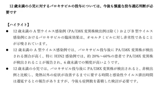 與此同時(shí),在瑪巴洛沙韋原研國家日本,日本感染病學(xué)會(huì)對瑪巴洛韋在12以下兒童的使用也采取了慎用的態(tài)度。在2023年11月27日修訂的《關(guān)于瑪巴洛沙韋使用的新建議》警告:在12歲以下兒童中使用瑪巴洛沙韋需謹(jǐn)慎。
