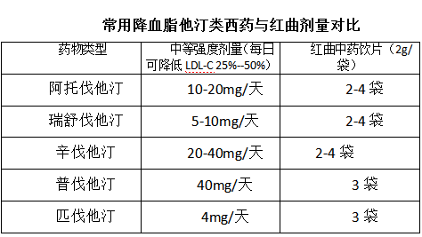 不同藥廠(chǎng),不同品牌的藥品規(guī)格均不統(tǒng)一,但患者每日攝入量均需以指南為準(zhǔn),所以在中等強(qiáng)度劑量下,每片(10mg)阿托伐他汀,對(duì)應(yīng)紅曲中藥飲片2袋(2g/袋),以此類(lèi)推。