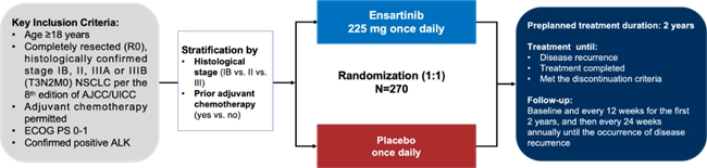 受試者按1:1隨機(jī)接受恩沙替尼(225 mg QD)或安慰劑治療2年或2年內(nèi)疾病復(fù)發(fā)或達(dá)到其他終止治療的標(biāo)準(zhǔn),隨機(jī)分組根據(jù)術(shù)后腫瘤分期(IB期 vs II期 vs III期)和是否接受輔助化療(是 vs 否)為分層因素。