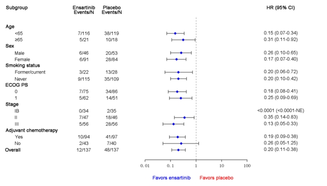 截止到2025年6月26日,在II-IIIB期患者中,兩組中位隨訪時(shí)間均為24.0個(gè)月。DFS HR為0.20(95% CI: 0.11-0.38;p<0.0001);恩沙替尼組2年DFS率為86.4%,安慰劑組為53.5%。在ITT人群中,DFS HR為0.20(95% CI: 0.10-0.37; p<0.0001);恩沙替尼組2年DFS率為87.3%,而安慰劑組為57.2%。各亞組中,傾向于恩沙替尼的DFS獲益一致。在ITT人群中觀察到具有臨床意義的CNS-DFS益處(HR 0.22;95% CI: 0.08-0.60)。OS不成熟(1%成熟度)。安全性與恩沙替尼的已知安全性一致。