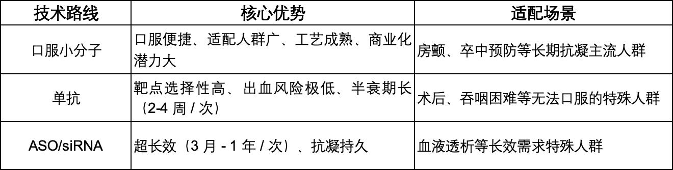 FXI/FXIa抑制劑主要分為小分子、單抗、ASO/siRNA三類技術(shù)開發(fā)路線,各有定位,其中小分子類憑借臨床進(jìn)展快、商業(yè)化潛力大、適配人群廣等優(yōu)勢(shì),成為未來(lái)市場(chǎng)的主導(dǎo)方向。