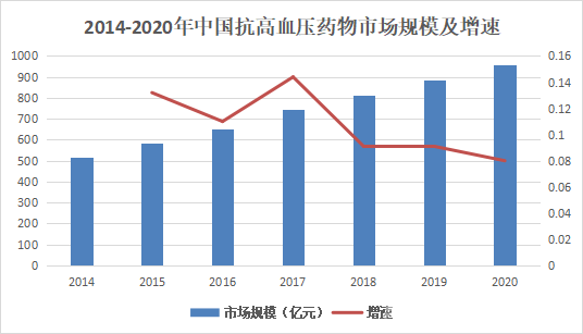 2014-2020年中國(guó)抗高血壓藥物市場(chǎng)規(guī)模及增速